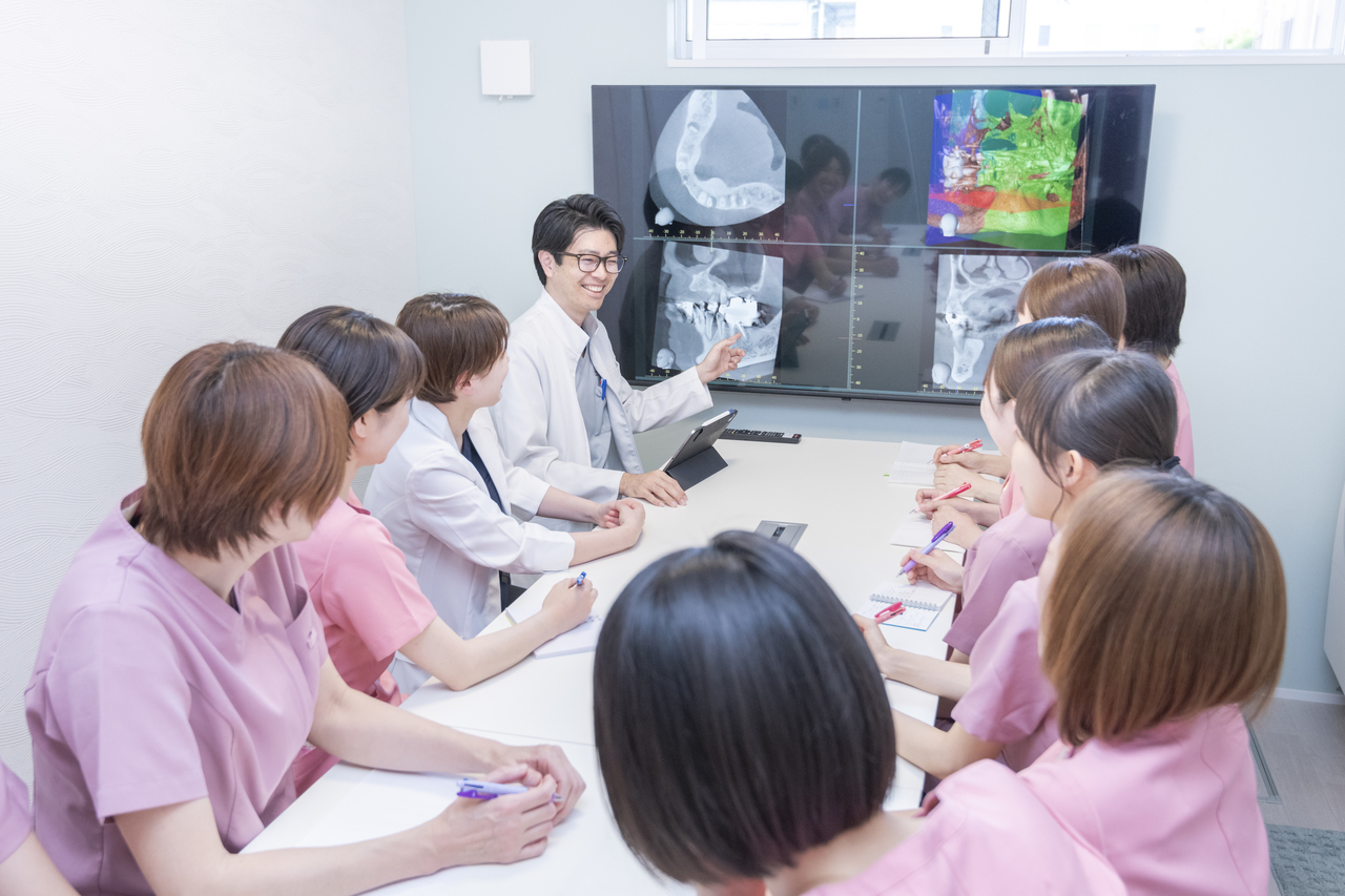 予防に関しても衛生士向けに月に2回、カリエスのリスク評価や実践についての勉強会や歯周治療の基礎から実践に至るまで定期的に勉強会を行っておりますので、どのように衛生士を教育し日々連携を取っていくかも勉強できるかと思います。